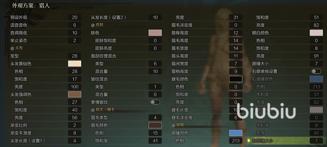 这里我们选择预设20号面孔开始细致的更改吧,音调选择10,音色选择6,然后可以将头发调整成浅色,银粉色为基础,然后加入一点棕色的强调色就很洋气了。皮肤可以选择粉白,然后眉毛类型选择4,颜色调整成为棕色,浓度调成0就刚刚好,眉骨调整为12,高度跟宽度都是14,就比较深邃了。