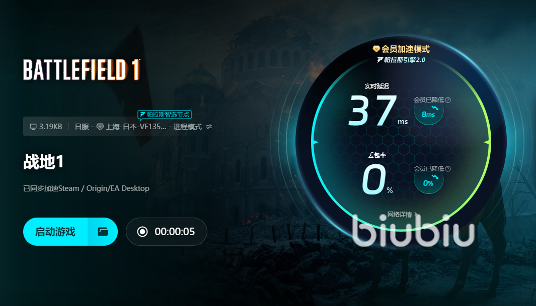 战地1这种大型游戏对大家的设备有一定的要求,包括网络环境也需要在一个非常稳定的环境下才能更好的操控这款游戏,即使大家网络的状态并不太好的话,也不用太担心,只需要下载一个biubiu加速器,如果大家下载biubiu加速器,新用户首次登录就可以领取3小时的免费加速时长,其次,输入:【biubiu不卡顿】还可以领取三天会员。