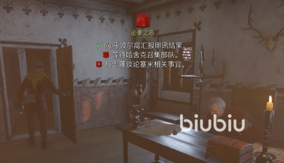 审判之后在早晨这个时间段跟冯·波尔高汇报情况,就会处于故事的关键节点,除“恶魔”外的支线任务都不能做。我们就根据提示完成这些交谈,这个章节的主要剧情我们就经历完了。