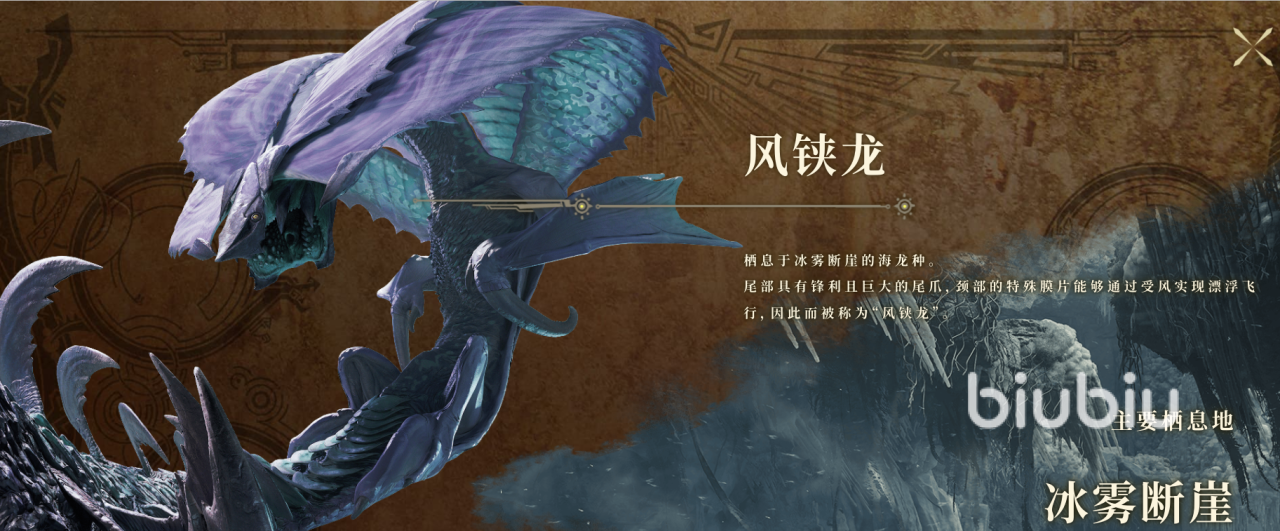 而号称荒野冰原的冰雾断崖中,则确认了第一只能飞的海龙种风颊龙。这只魔物的出现让斩斧套装终于有了来源,真是让人兴奋不已。它以风属性攻击著称,擅长利用强风和锋利的翼刃进行战斗。风颊龙的攻击方式包括快速冲刺、风刃攻击以及制造旋风困住猎人。利用环境中的强风增强自己的攻击力。
