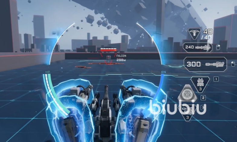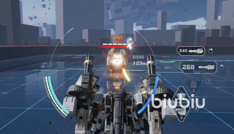 首先,三角龙的左键技能是转轮机枪,它发射的是强力光束,能够有效地进行火力压制。无论是远距离的敌人,还是近距离的小型机甲,都能轻松扫除。左键的攻击持续时间长、威力大,完全可以用来维持对敌人的压力,阻止敌人推进。接下来是右键技能——大号转轮机枪,发射高速光束,射速极快,能给敌人带来极大的威胁。迅猛的射速让敌人根本无暇反击,而且这个技能的优势在于不仅有高频率的伤害输出,还能有效对敌人的机甲造成持续压力。要是你想一波压制敌人,右键一定不能轻视!
