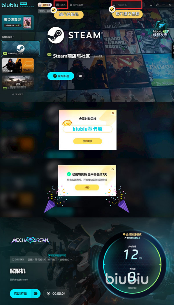 大家在驾驶机甲时,可以点击上面的链接下载biubiu加速器加速网络环境,现在有个好消息,新用户注册能得到3小时的免费时长,还觉得不够的玩家可以使用兑换码【biubiu不卡顿】再得3天的使用时长。