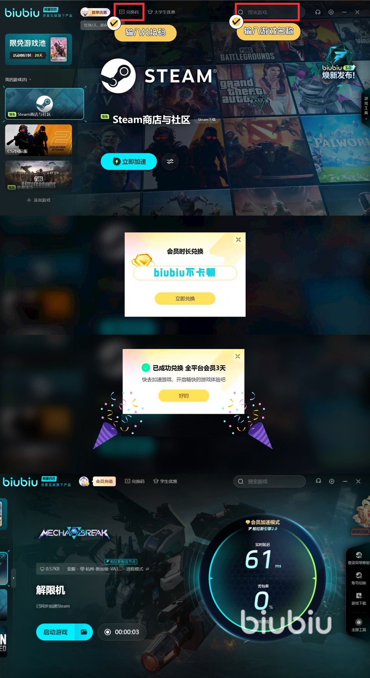 在目前官方和玩家们呼声较高的配色方案中,小编给大家找到了几种确定可以实现且看起来美观的方案,首先是经典机甲作品高达中人气很高的基拉机甲,整机以白蓝两色为主,内构为黑黄,余下部分则选择灰色加红色。其次是EVA中出现的初号机配色,整机为大量的绿色和紫色,内构颜色也相同。但是毕竟这是一款大型游戏,如果在修改涂装的过程中因为闪退等问题导致涂装没有及时保存,那就非常麻烦了。针对这种情况,小编推荐大家使用对新手非常友好的biubiu加速器。通过新用户注册可以领取到3小时免费加速时间来体验游戏, 后续用【biubiu不卡顿】兑换码也能获得长达3天的加速时间。