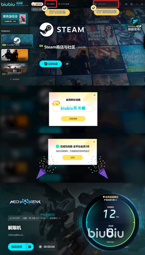 玩各种机兵时可以点击上面的链接下载biubiu加速器进行加速,现在用biubiu可以获得新用户注册得3小时的免费时长的福利,另外输入兑换码【biubiu不卡顿】还能再兑换3天的免费加速机会。