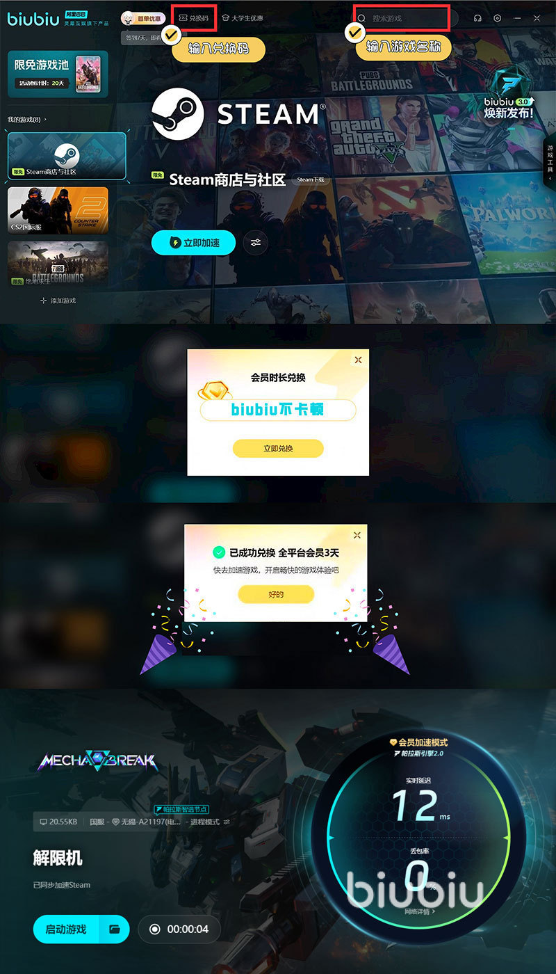 为了确保大家稳定体验不同玩法,强烈推荐大家使用biubiu加速器,大家只需点击页面上方提供的下载链接,就可以轻松开始安装过程。对于新用户来说,这里有一个特别的福利等待着大家:新用户在首次使用biubiu加速器时,大家将享有3小时的免费体验时间。此外,平台还为大家准备了一个独家兑换码,输入兑换码【biubiu不卡顿】,即可将大家的免费体验时间延长整整72小时!