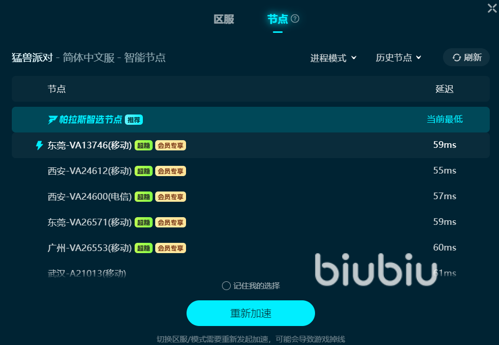 挂上biubiu,你会惊喜地发现,小动物在战斗和移动时都变得丝滑流畅,再也不用担心延迟问题。而且,其支持的服务器节点丰富,帕拉斯智选节点帮你调整连接当前最低点,大家无需手动调整,就能确保游戏稳定运行。
