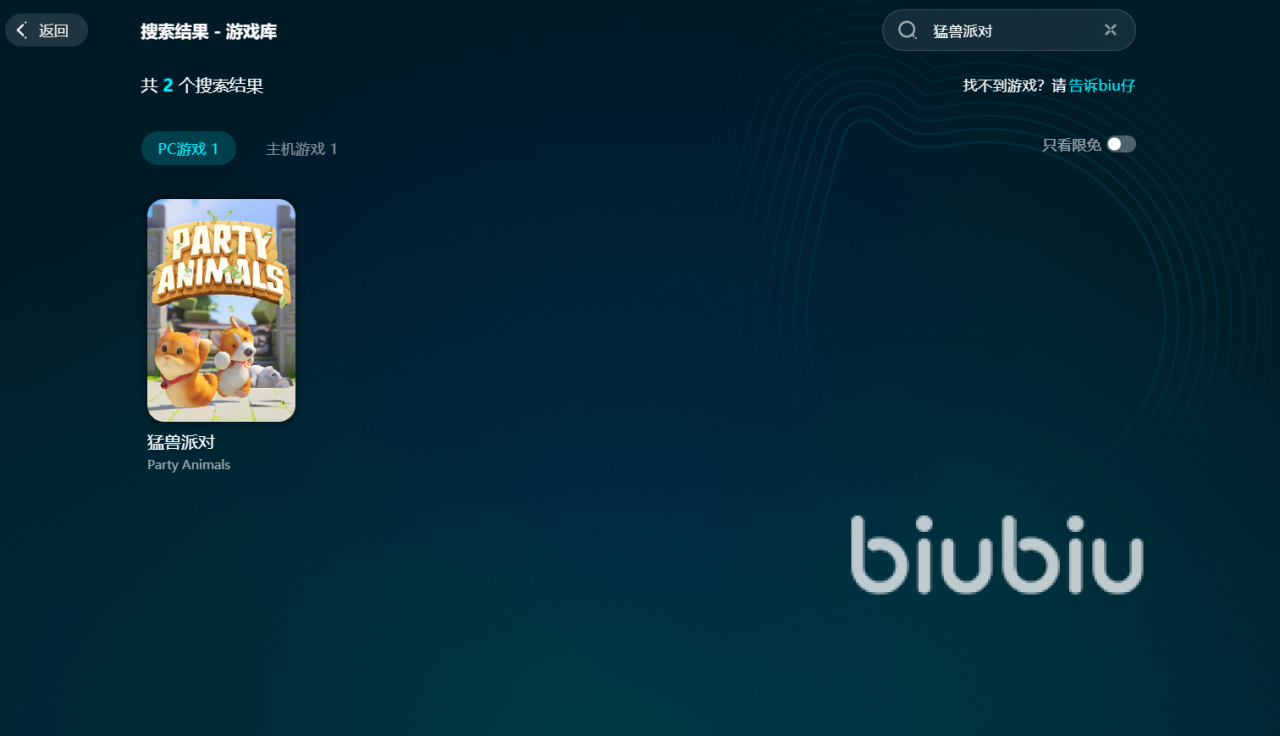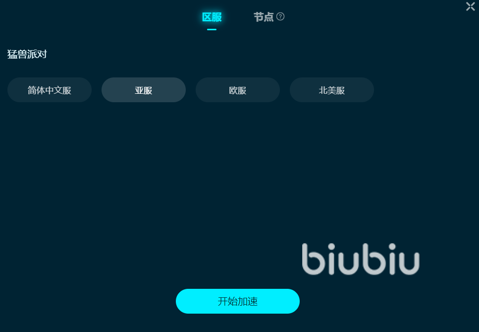 使用biubiu的过程也非常便捷,点击上文按钮即可快速安装,打开软件后,没有恼人的广告和插件干扰。只需搜索“猛兽派对”,定位游戏后点击图标,选择简中服、亚服、北美服等区加速,软件会根据你的网络环境自动搭建最佳网络通道,操作简单,表现出色。