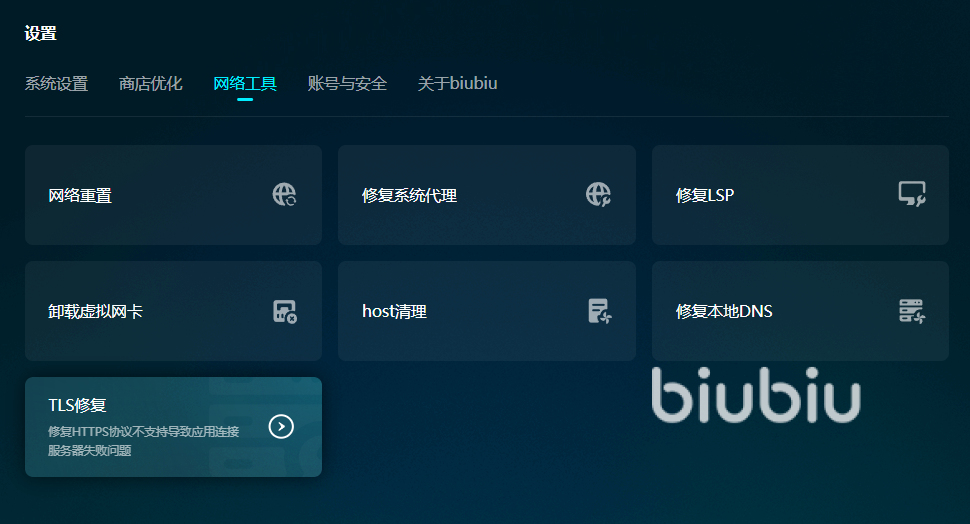biubiu还有别的功能来帮助用户改善电脑环境以及优化游戏商店,如果你的电脑网卡出现了故障,或者出现网页无法加载的情况,那么可以试着用biubiu工具来修复它们。工具的使用方法很简单,很快就给大家带来全新的电脑环境了。