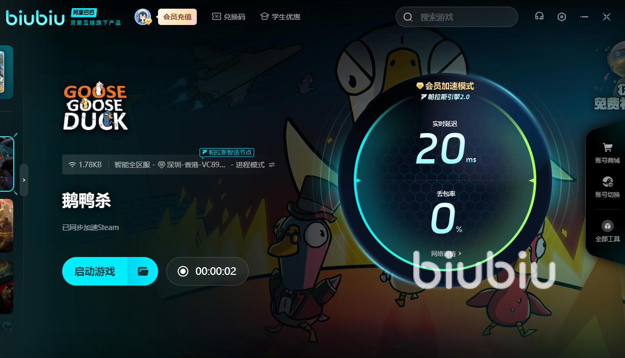 鹅鸭杀作为一款优秀的海外佳作,如今暂时还没上线国服。若是我们打算加入鹅鸭大战的话,就好借助biubiu。通过加速后,就能被别人送入太空飞船中,继续展开对战!新用户的话,可获得三个小时的免费加速;然后新老用户输入【biubiu不卡顿】,就能额外领取三天免费加速。要是在推理过程中太卡的话,那就会被对手率先解决,或者无法完成任务。用上加速器后,才能加快自己的节奏,完成属于自己的任务。