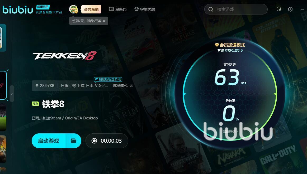 对于追求极致体验的玩家,biubiu加速器提供双重加速保障,新用户注册即获3小时全游戏免费加速,输入兑换码【biubiu不卡顿】可再领3天高级会员。该加速方案完美适配铁拳8的帧数判定机制,在段位赛中开启加速服务后,系统将优先分配带宽至游戏数据包传输,确保三岛平八的恶魔激光与风间仁的魔神连腿都能精准触发。软件内置的实时网络监测面板,可让大家直观地查看实时的传输路径和延迟补偿状态,配合合适的节点,让玩家随时享受本地对战级的流畅体验。