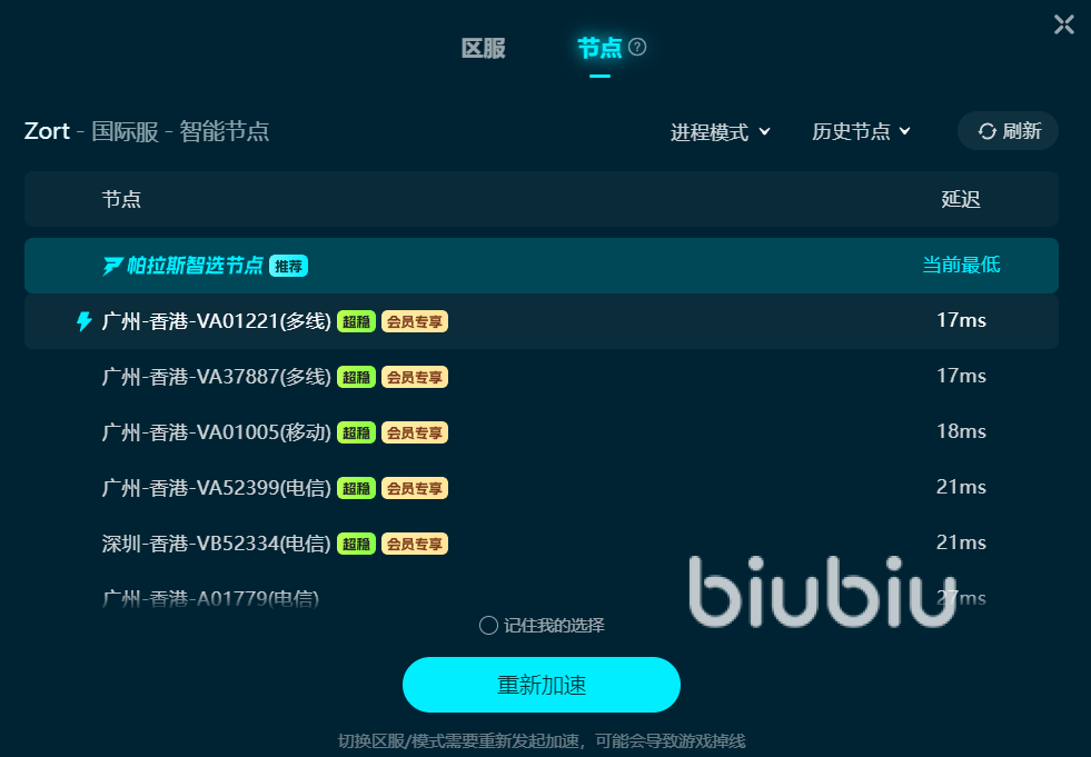在线数据传输时,大量数据包会给网络带宽带来压力,数据量越大,对网络带宽要求越高。biubiu通过采用帕拉斯大数据预判重传技术,在弱网环境下也能维持帧率稳定。加上广泛的全球节点,无论你身处何方,都能快速找到距离最近节点,保障网络连接的稳定与速度。