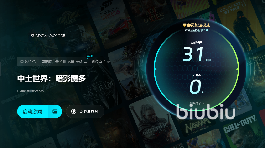 游戏为各位呈现出了一个广阔中土世界,等待小伙伴们来进入其中去探索,同时涵盖了多种不同的任务类型以及挑战,结合高质量图形以及音乐效果,为玩家提供了沉浸式体验,可若是此时大家的网络方面出现了卡顿,或是有存在明显延迟等情况可就很难受了,因此还需去提前打开biubiu这类工具来帮自己实现进一步的优化。