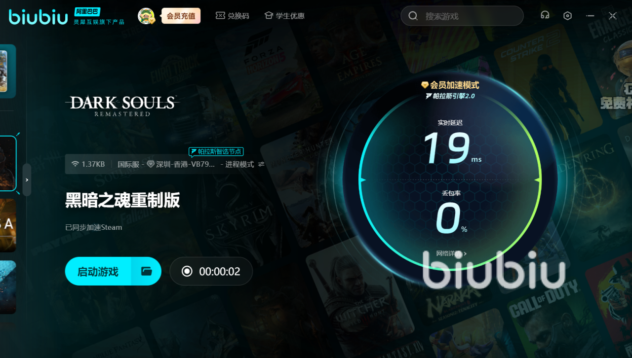 biubiu支持作品众多,不管是热门大作还是小众精品,都能为其提供优质的服务。可见搜索后游戏库内包含暗黑系列的多部作品,它的操作非常简单,搜“黑暗之魂重制版”,轻轻一点图标,系统自动匹配智能节点,全程无需手动设置。启动页面直观展示优化后的网络状态,延迟、丢包数据一目了然,放心开启黑暗世界冒险。上线可感受到,战斗操作更加流畅,攻击、防御、躲避一气呵成。