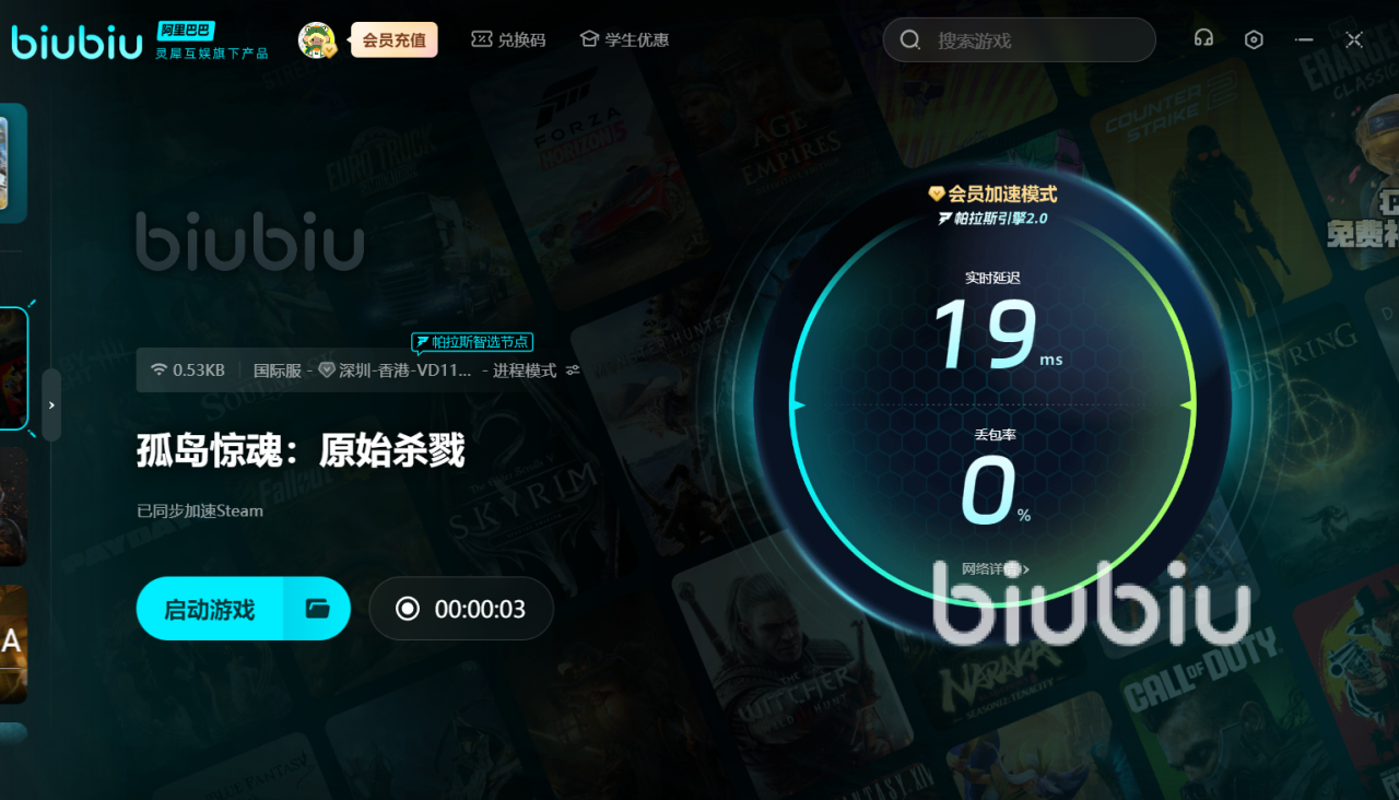 biubiu支持海量游戏,无论是炙手可热的3A大作,还是小众却独具魅力的精品,都能实现极速加速,各类游戏服务器均在其高效加速的覆盖范围之内。孤岛惊魂原始杀戮在广受欢迎的steam平台发行,biubiu不仅能让游戏本体运行如飞,还能对steam进行同步加速。如此一来,你能在线加快更新dlc或者逛商店社区,性价比很高。