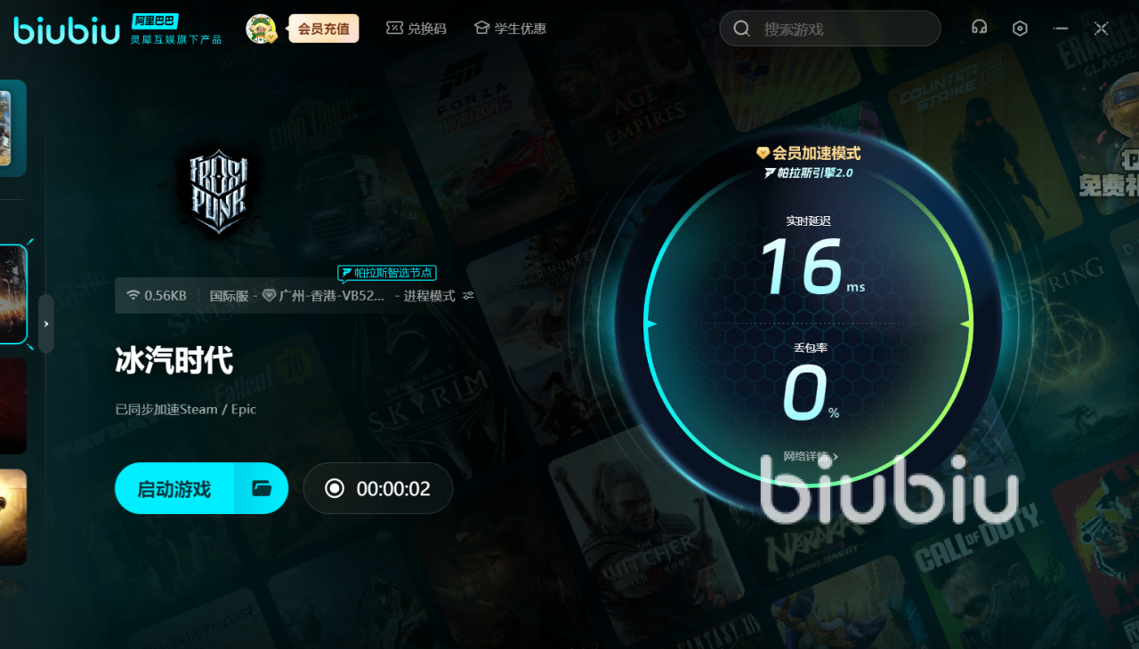 biubiu软件的操作也十分简单,哪怕你是电脑小白也能轻松上手。平台上汇聚了市面上绝大多数热门游戏,不管你是喜欢动作冒险、角色扮演,还是策略竞技类游戏,它都能满足你的需求。大家登录后,在软件首页的搜索框输入“冰汽时代”名称,搜出点击对应的图标,就能一键开启加速,无需排队等待,即开即用。可见小编启动后,延迟值直降到16ms左右的极低水平,丢包基本上为0。