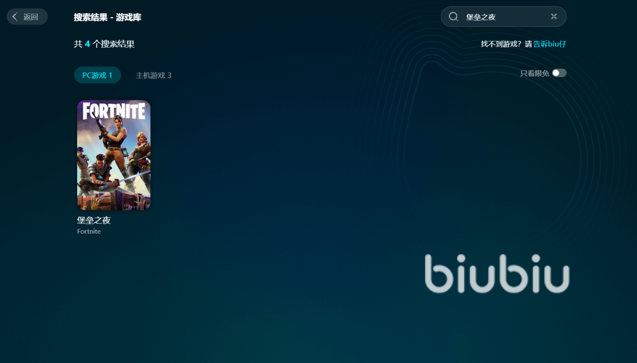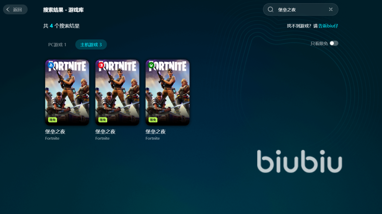 如今,玩家使用多个设备打游戏,早已不再局限于传统端游。无论是各类PC客户端游戏,还是主机端游戏,biubiu库中大多数能搜索到。而且好消息是,堡垒之夜的主机端正处于限免活动期,大家不妨亲自上去体验一番。