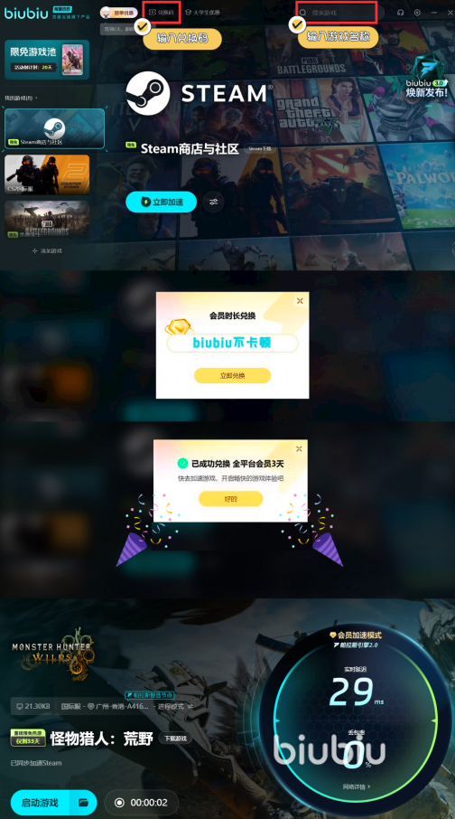 大家在和艾露猫冒险前可以先下载biubiu加速器加速,现在biubiu客户端会上线一个怪物猎人活动,时间是2.28到3.14,参与抽奖就有可能拿到游戏本体、1小时、3小时与3天会员、年卡、本作周边等奖品,此外即日起到3.14玩怪猎荒野还能限免加速,新用户注册会额外赠送3小时免费加速时长,输入兑换码【biubiu不卡顿】还能再得3天免费时长。