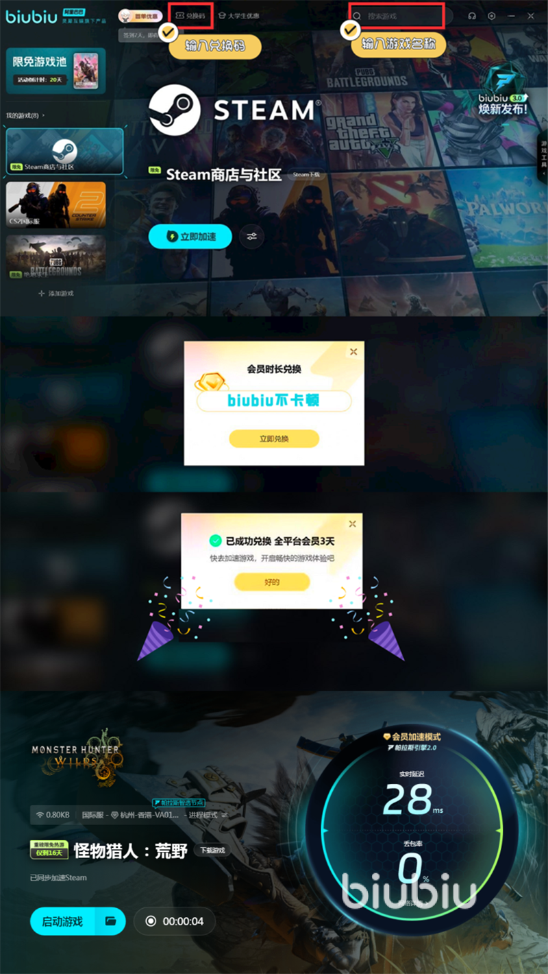 为了能够保证游戏过程顺畅,尤其是在联机的时候,在多人战斗过程中也不至于出现掉帧卡顿等现象,biubiu加速器的优化功能非常关键。现在biubiu除了常规福利,注册新账号给三小时会员时间,每个号都能通过兑换【biubiu不卡顿】获得一次兑换奖励72小时会员时间之外,还专门针对怪物猎人荒野推出了一系列活动。首先是大家喜闻乐见的抽奖,抽奖时间是在2月28日13点到3月14日59点59分,奖品主要包括游戏本体、游戏周边,还有biubiu的会员时间等,甚至可以直接抽到biubiu的年卡。第2项也是和玩家关系非常大的,那就是在即日起,一直到3月14日59点59分,这一段时间里都是怪物猎人荒野限时免费加速时间段,也就是在biubiu中可以直接去免费加速这款游戏,非会员也可以。