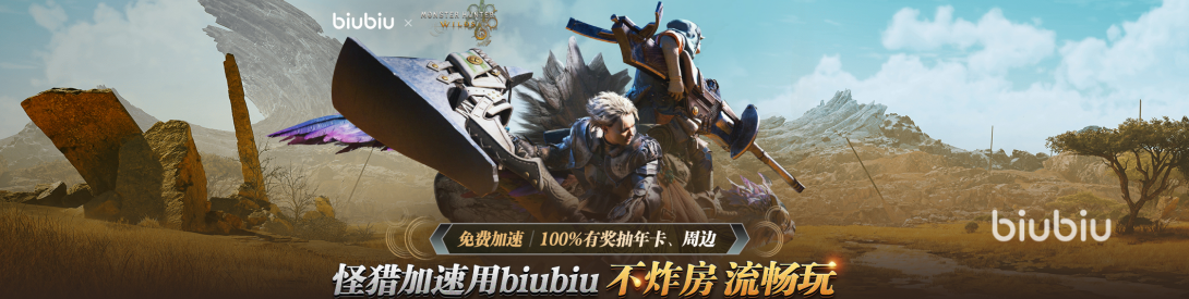 大家在游玩本作前可以先下载biubiu加速器,现在biubiu客户端将上线怪猎的抽奖活动,时间是2.28到3.14,只要参与就有机会拿到游戏本体、1小时、3小时和3天会员、年卡、游戏周边等奖品,此外即日起到3.14,玩怪猎荒野还能直接限免加速,新用户注册会额外赠送3小时免费时长,使用兑换码【biubiu不卡顿】还能再得3天免费时长。