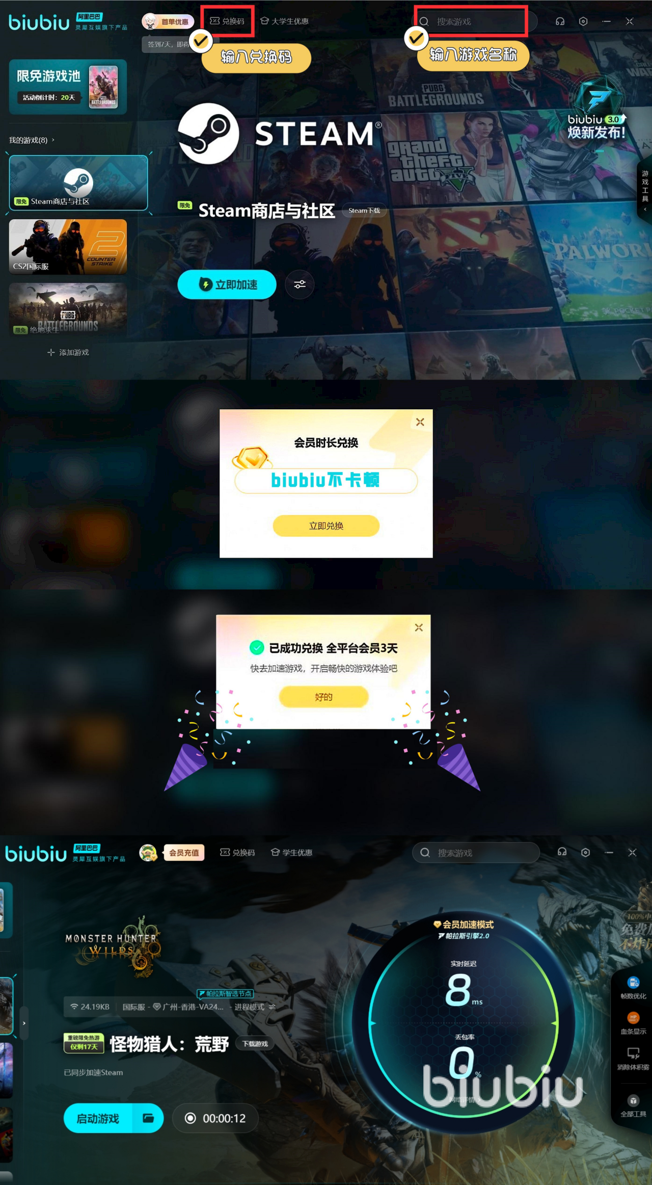 biubiu加速器就是解决这些问题的神器,它能大幅提升网络速度,确保怪猎不炸房。现在,新用户福利满满!首次使用biubiu加速器的新用户,可享受3小时免费加速时长。搭配兑换码【biubiu不卡顿】,各位还能获得72小时加速时长,新老用户都能参与这一兑换福利。