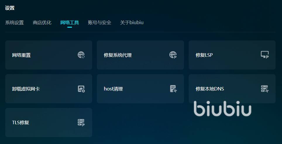 biubiu的工具箱也是一个很好用的功能,当网页无法加载,或者无法进入游戏,都先用工具修复它们。系统修复也是免费的,电脑里安装biubiu就等于安装了一个全能的游戏助手,不管是加速还是解决故障都能轻松搞定。