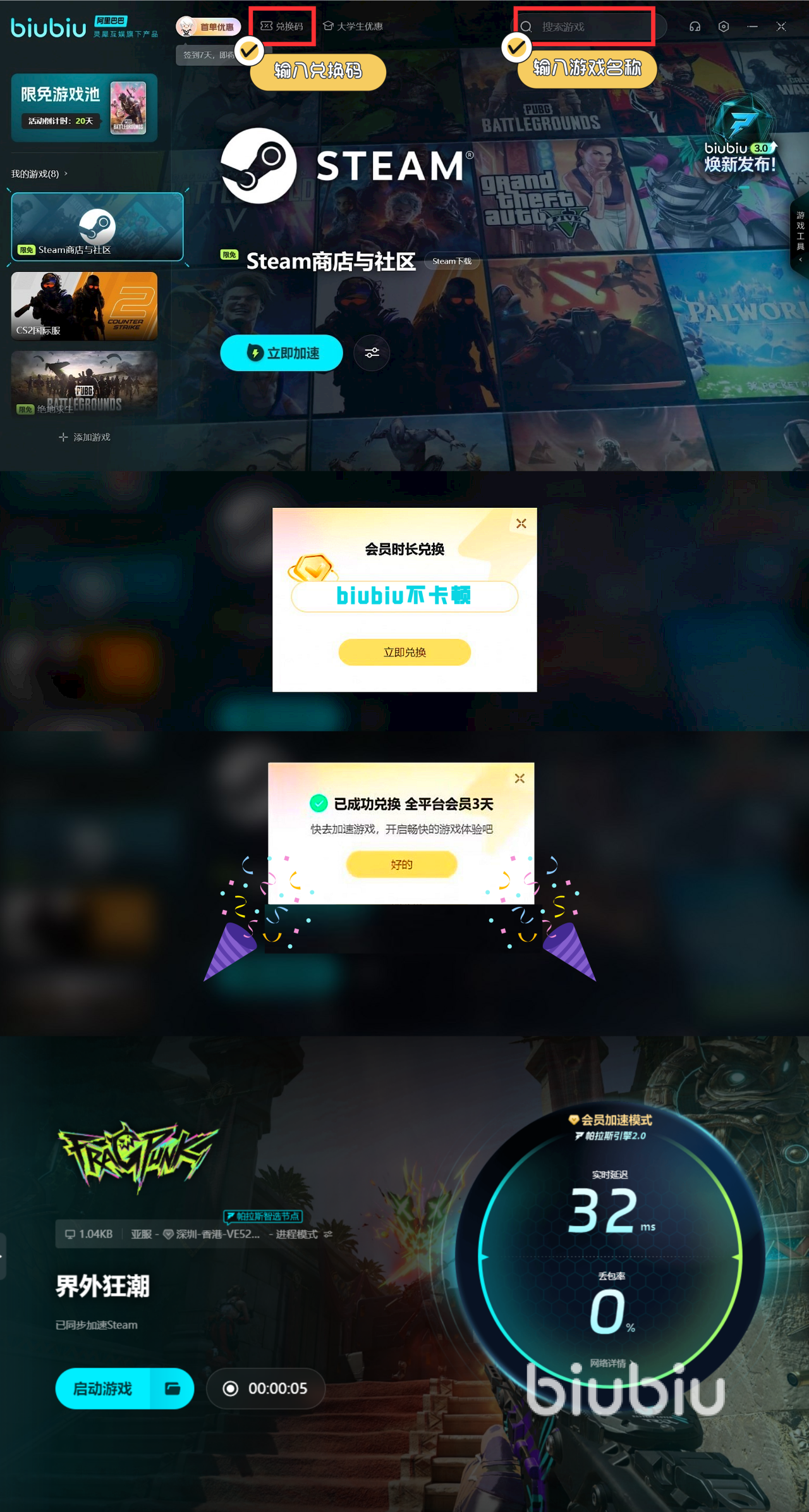 福利差点忘记告诉大家了,现在新人注册之后,立马拿到的就是3小时的赠送服务时间,还有个【biubiu不卡顿】的码,新老用户其实都可以使用的,那各位就可以继续再获取额外的72小时加速时间,那最终给新用户使用的福利就是75小时了。