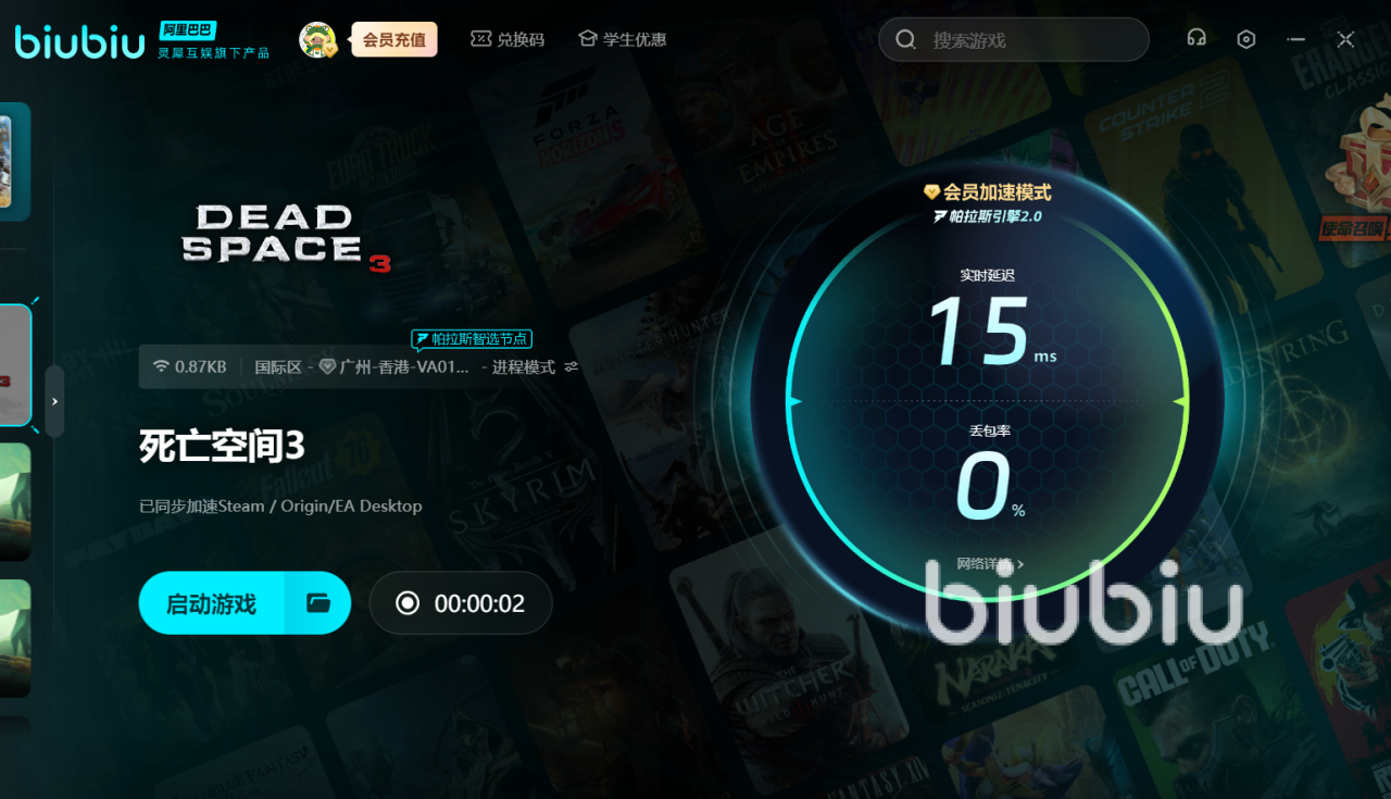 2025年02月28日 18:22 来源:流星欲大舌头死亡空间3作为死亡空间系列第三部,它巧妙融合了恐怖、动作与探险元素,为玩家打造出一个充满未知与惊悚的宇宙世界。不过死亡空间3掉帧怎么解决呢?很多人在沉浸式刺激冒险时,却发现射击时卡顿掉帧。别慌,biubiu加速器来救场!一键开启迅速解决掉帧,让操作顺滑跟手,对枪不卡顿,尽情享受竞技快感。