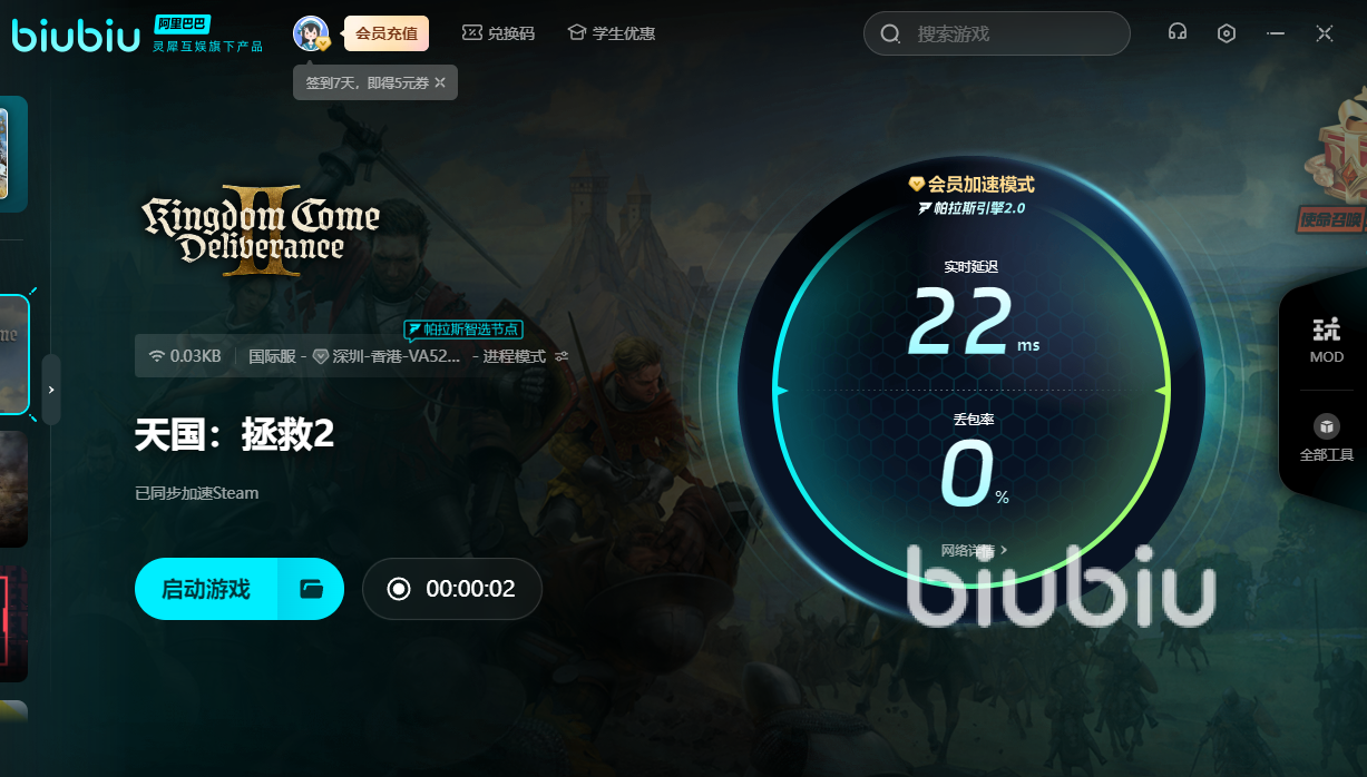 天国拯救2优秀的海外角色扮演大作,我们想要来到这开始新的人生。可以先使用biubiu,通过提速后就能获得成为男主角的资格,继续逐鹿。新用户的话可获得3小时的免费加速,另外新老用户输入【biubiu不卡顿】,就能额外领取三天免费加速。如果在刚开始展开打斗时太卡的话,可能连一些守在门口的守卫都打不过。所以必须用上加速器,才能先一步解决一些基础门卫。