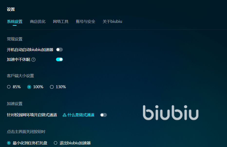 用户还能根据自己的习惯对biubiu进行设置,它支持开机自动开启软件,还支持长时间加速不休眠,并且可以将软件最小化到后台去继续加速,一点都不会影响大家对游戏的操作。软件推出无感切换功能,切换游戏还是切换模式都很丝滑,用起来特别省心,刚接触biubiu的小伙伴只要用过几次就能掌握它的使用方法了。