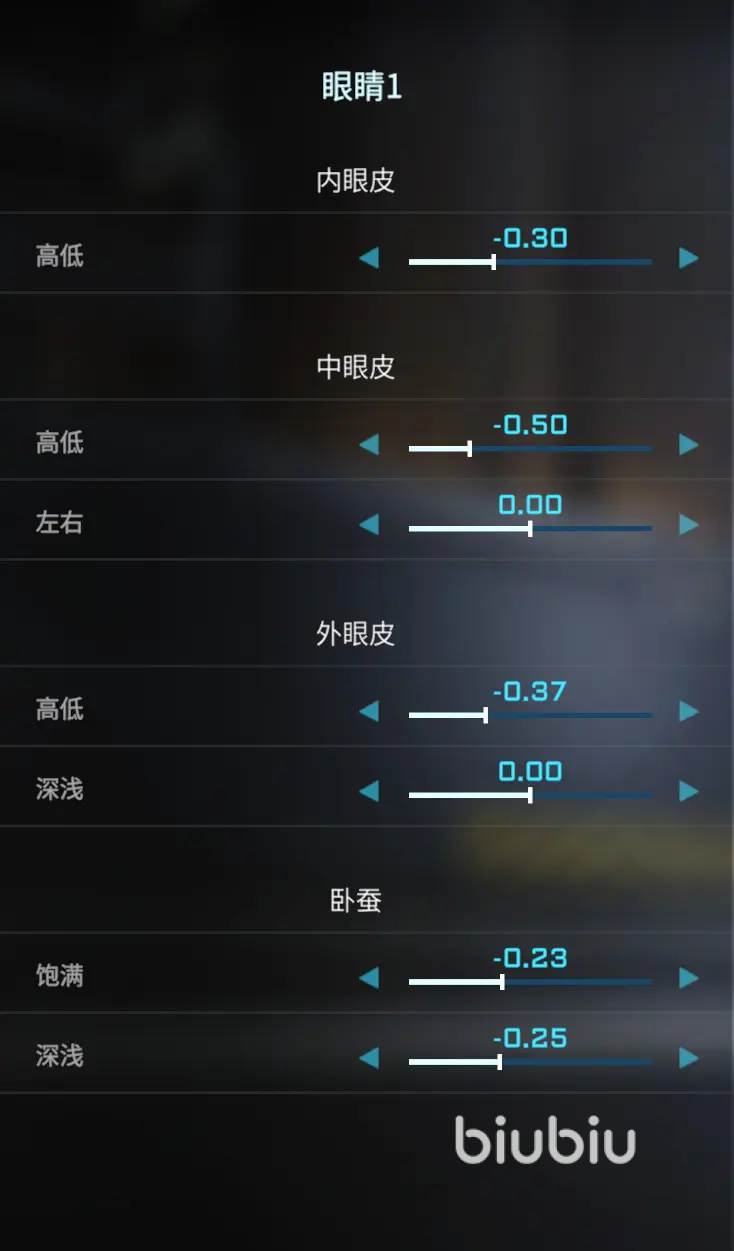 眼睛也是选择第一个,大小调整到0.52;鼻子选择第二个,嘴巴直接选择二,只用调整整体,上下唇不用动,表情选择1,妆容和修容选择5,眉毛选择1,眉毛的细节可以酌情来调整,眼影可选择浓或者淡,更建议淡一点;发型选择7的双马尾。