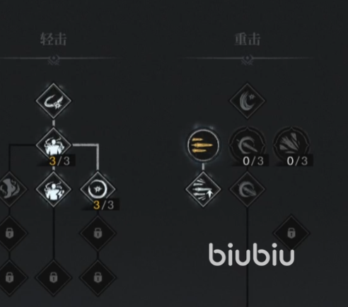 不管大家选择的是哪一个流派,在加点时都需要先去点轻攻击,然后去点轻攻击的衍生攻击去给这些攻击点满,在点满以后去点重攻击,这重攻击加点也是一样全部点满,随后点策略攻击,这个先点左边。