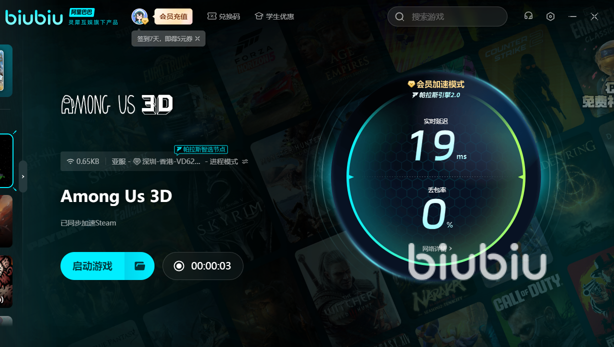 AmongUs3D作为一款新出的海外佳作,如今暂时还没有上线国服。所以我们必须先使用biubiu,经过稳定加速后,又能让你有机会进入新的太空船上执行自己的任务。新用户的话可领取三小时的免费加速,然后新老用户输入【biubiu不卡顿】,即可额外领取三天免费加速。若是进入太空船后太卡的话,就无法及时做完游戏内的任务。这时采用加速器后,作为船员的我们才可加快节奏去修复太空船。