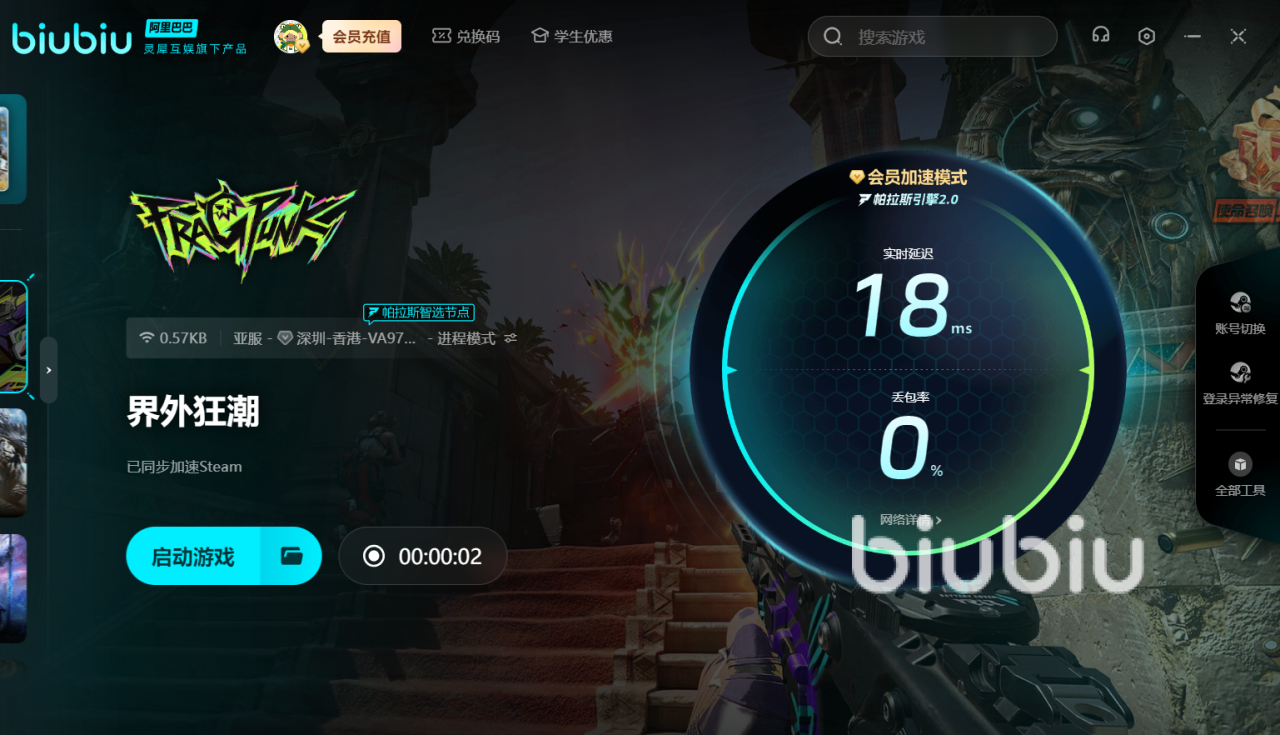 上文已经为你全面解答了“界外狂潮闪退卡顿怎么办”的难题,界外狂潮是热血沸腾的竞技射击游戏,其紧张刺激的对战场面、精妙绝伦的射击手感,想要尽情享受这款游戏的魅力,那就使用biubiu为《界外狂潮》加速,让你告别卡顿,畅玩无阻!