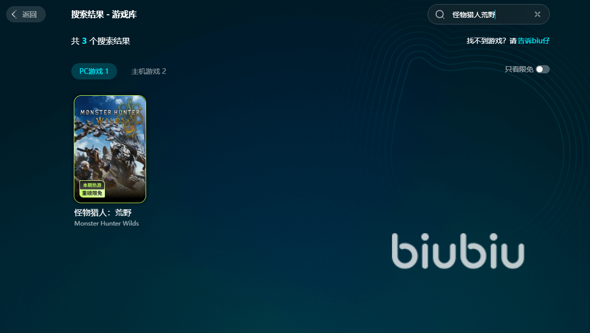 同时biubiu端内将上线怪物猎人活动,活动时间为2月28日13点-3月14日23点59分,抽奖奖品内容包括游戏本体、游戏周边、年卡、3天会员、3小时会员、1小时会员等,怪猎荒野限免加速时间为即日起-3月14日23点59分。