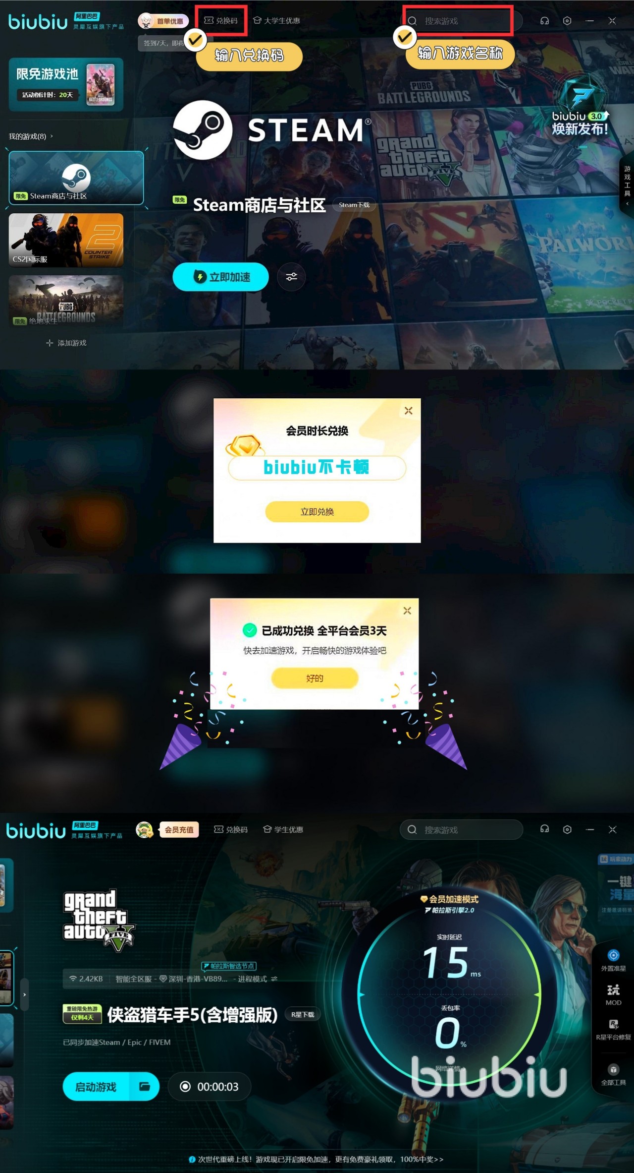 为了确保玩家能够畅享《GTA5增强版》的精彩内容,biubiu加速器无疑是最佳选择。现在,新用户首次注册成功,即可获得3小时的免费加速时间,让玩家初步体验其强大功能。更为惊喜的是,只要输入兑换码【biubiu不卡顿】,还能额外领取72小时的免费时长,令你尽情畅玩游戏,无需担忧网络问题。