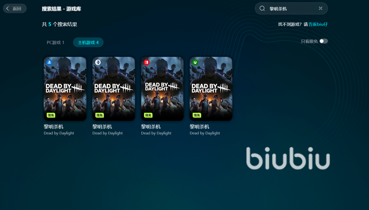 值得一提的是,biubiu还支持多个《黎明杀机》主机端,比如switch、Xbox等,且主机端目前处于限免阶段。对带有绿色“限免”标志的作品进行加速,无需会员即可享受。玩家只需按照图文教程简单完成网络和DNS设置,就能获得同样优质的服务。喜欢用手柄打杀机的小伙伴可不要错过哦!