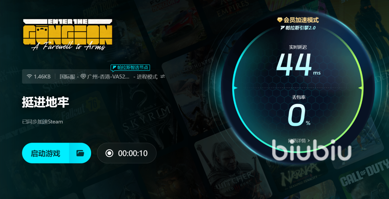 挺进地牢虽然单人游玩的流派选择众多,但也是能支持多人模式的,可以选择本地合作或者远程进行联机,这样双方就能组队挑战地图了,而双方挑战地图最大的优势就是容错率很高,而且选择的流派可以汇聚在一起,形成五光十色的特效,但是联机很容易掉线,那么就可以使用biubiu来优化网络,并且新人在注册后便获3小时免费加速,新老用户均可使用兑换码【biubiu不卡顿】可获3天免费的使用权哦!