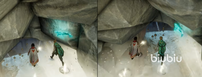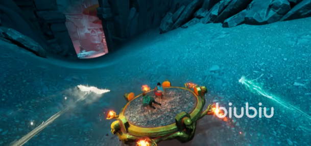 打完这两个怪物,这个关卡也就结束了,地面也开始震动,在抖动的画面中,两个玩家都要安全通过狭窄的栈道,继续往前。在到达平台后,这时候奇幻女主佐伊会碰触地上的光芒点,然后被击飞出去,这时候科幻女主米欧需要过去,帮忙救起佐伊,然后两个人在安全的光球里面缓慢前进。一旦有人脱离光球,就会被落下来的巨石以及激光打中,或者没配合好掉下平台,就要失败重来了。