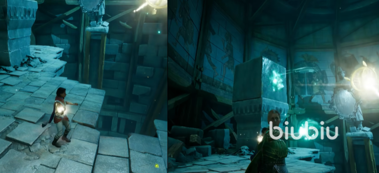 过关之后就来到了有雕像的地方,墙上的壁画都是主角的记忆,然后地面上会出现奇幻女主的家。动画结束之后继续过去,还是一样的点亮机关,不断前进。