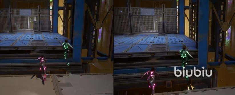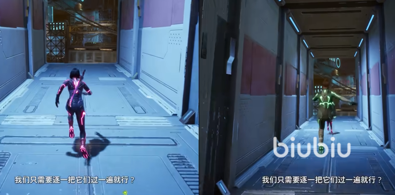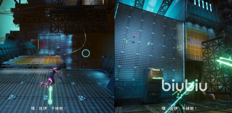 这里有很多sri的机器人以及巡逻车,还会发射红色的能量弹。两个主角先要解决,近距离用鞭子打,就能很快清除掉了,然后需要分两路走。左边基本上都是平地,科幻女主走这里,通过触碰机关就可以让平台移动起来,简单的跳跃就能过去,右边则是很多跳跃装置,奇幻女主走这条路,需要玩家用鞭子顺手一点,像钩爪一样抓紧,才好过去的。如果分不清人,就对应自己的衣服颜色去选择就行了。