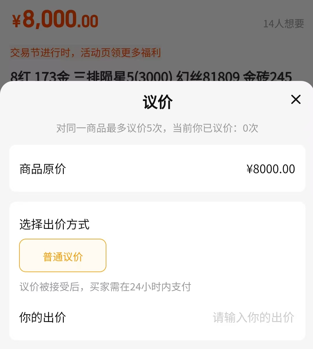 有些玩家觉得部分账号很符合自己的需求,但是价格方面还是太贵了,觉得还是不支持购买那么启动议价功能,利用这个功能跟出售方进行议价,如果议价成功的话,那么就可以较低的价格入手哦,而且双方的交易都会有官方的保护,不会出现双方权益丢失。