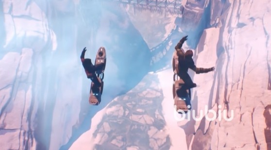 管道滑完之后,就会掉落一个山崖,这里要把控好角度,把中心点对准地面才能安全落地。后面的赛程地势就很多变了,看到要更换平台记得要微微抬下视野镜头,方便冲刺平稳落地。