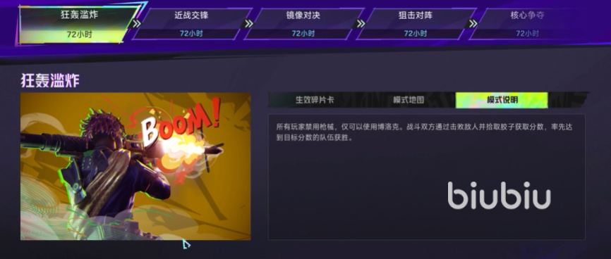 狂轰滥炸:首先来看下打头的模式,这个玩法下面,所有参与者是不可以使用枪械的,只能够使用博落克,就看谁的准头更好,发射炮弹的时机更准确了。击败敌人之后,获胜者就要去拾取胶子来进行分数的获取,双方里面,先达到目标分数的那一方就是获胜者了。