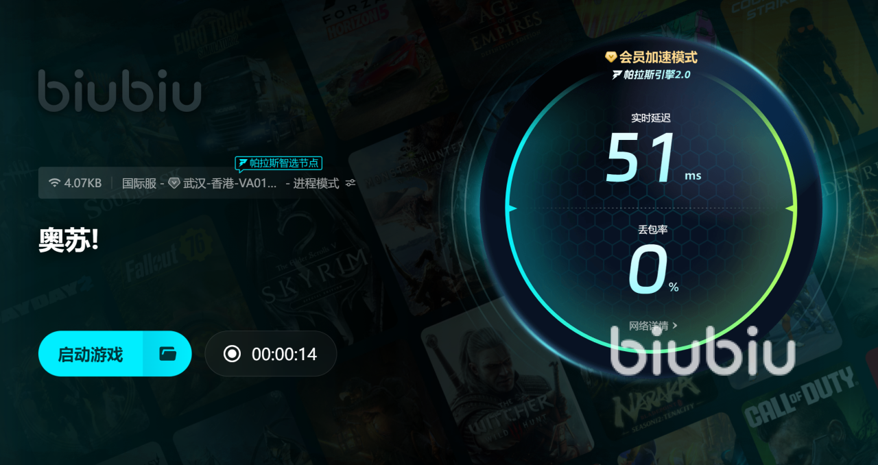 针对《OSU!》这类对延迟敏感的游戏,biubiu独有的WIFI/4G双通道无缝切换技术可实时监测网络波动,在检测到当前线路延迟升高时,自动切换至更稳定的通道,避免因突发卡顿导致的“Miss”判定。biubiu的使用方法简单到不能再简单了,搜索找到对应游戏,即可一键开启加速。