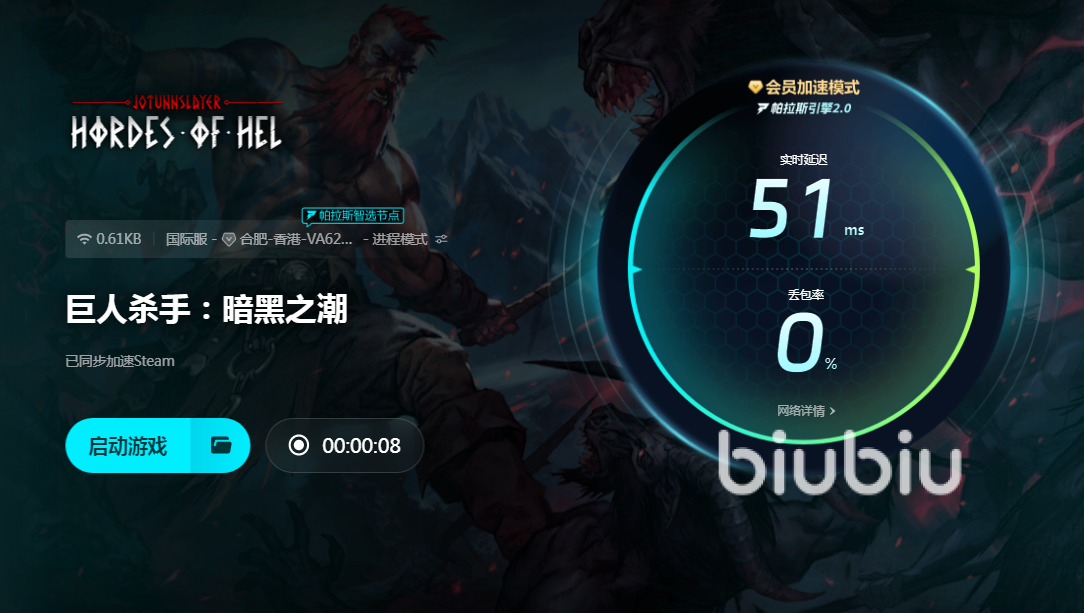 这款游戏融合了肉鸽元素,让每一次挑战都充满着未知风险和奖励,玩家所面对的敌人与挑战也都是随机的。游戏中还有丰富的角色选择,例如战士,法师,弓箭手等,都有独特技能天赋和武器。还设置了高难度挑战模式,在此模式,中任何失误都有可能导致失败,所以很多玩家在挑战高难度的时候都需要有一个流畅的环境,一旦出现闪退肯定会导致失败。这就需要有加速器来提供优化,小编推荐给大家的是biubiu。推荐这款软件的主要原因,就是因为它的核心功能方面非常强大,自身研发出来的帕拉斯引擎2.0,专门为了解决加速过程中的痛点所设计,无论是闪退掉帧这样的问题,在这里都能轻松解决。