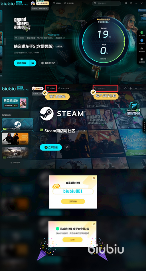 不想让延迟毁了游戏体验?那就赶紧试试biubiu加速器吧!新用户注册直接赠送3小时加速时长,让你瞬间告别卡顿。更刺激的是,兑换码【biubiu001】可以让你获得72小时的免费加速时长,通用新老玩家,无需任何复杂操作,领取后秒到账。新用户注册再加上兑换码,75小时的超值加速时长直接到手,畅玩三天轻松搞定!老玩家也别错过这波福利,赶紧去领取,流畅游戏从现在开始!