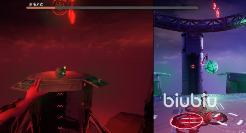 从外面看,这里面是有很多人的,在找不到大门的时候,我们的意识进入了球形机器里面,跑进去开始闯关,解锁大门。这里两个主角的路线是不一样的,加上现在操作的是球形无人机,所以很多关卡是需要借助飞船里面的设备,远距离用激光炮命中才可以开启的。