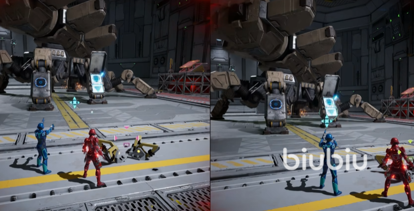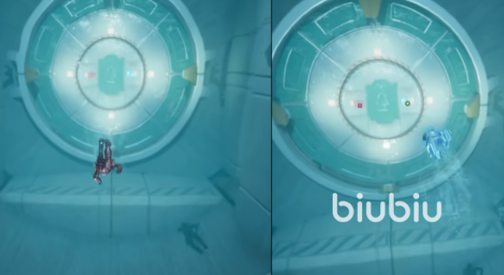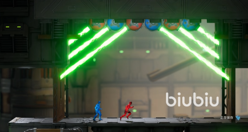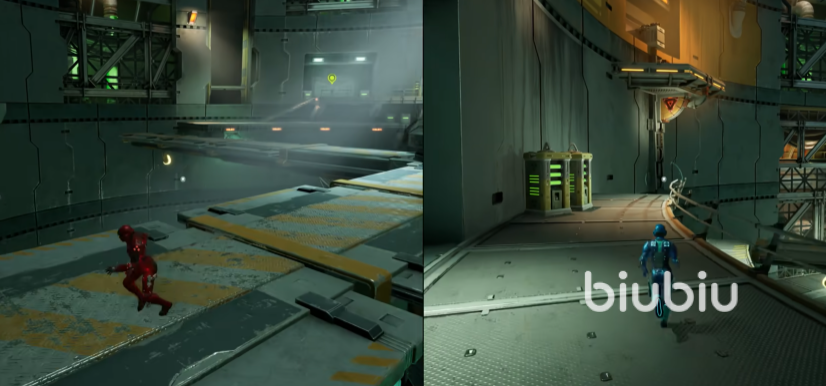 进去后两个人配合好,关掉机关,打开生产区的门,就可以进入控制区域了。这里是分布了机器人的,要注意优先击杀的。进入中心位置,需要通过旋转的设备平台,跳到对面去,有小机器人在墙壁上的,要先打掉。