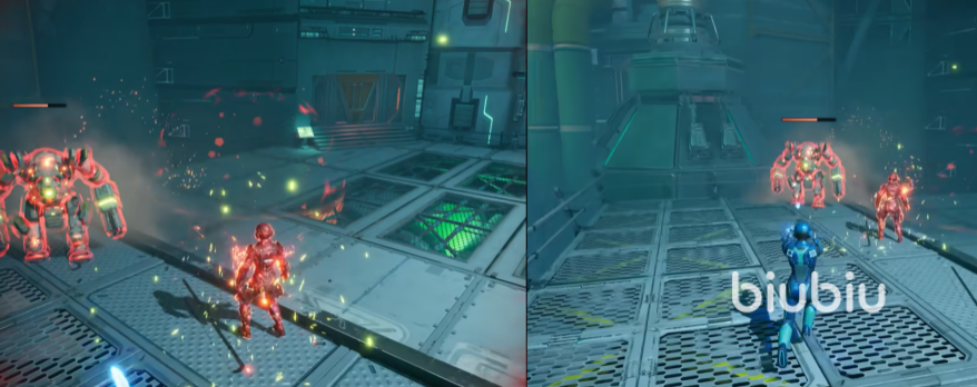 过去门那边就更接近中心区域了,这里有更多大型机器人,又是一番交战。打完之后过去机器滚轮,就会看到支线入口,进去之后就是过火圈游戏,闯过就行了。