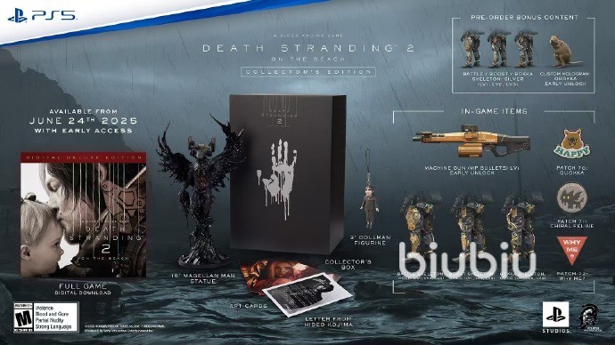 典藏版售价229.99美元(约合人民币1663.81元),内容极为丰富。除了游戏本体的下载码外,还包括以下独家内容:配备了15英寸的麦哲伦人塑像、DOLLMAN迷你塑像、艺术卡片以及小岛秀夫的亲笔信。还附赠金色外骨骼、贴纸和提前解锁的机枪等游戏内道具。购买典藏版的玩家可提前48小时进入游戏,于6月24日开启冒险。